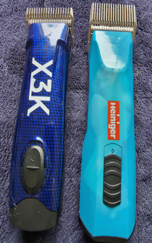 My first impression on firing them up was how noisy they are when compared to the Heiniger Opals. I would say that the X3K clippers are as noisy as the Wahls I sold-on in the past as being too noisy and with too much vibration. I've made a short video of the two running the same 5FC blade so you can hear the difference in sound - click HERE to view. As well as being significantly louder than the Opals, the X3Ks are 25g heavier, vibrate more in the hand (just like the Wahls), took longer to fully charge and only have one speed rather than the two speeds of the Opals. Single speed isn't a problem for me as I rarely use the slow speed anyway, but if you like two speeds then this is a consideration. I haven't used them for long enough yet to be able to say if the charge lasts as long as the Heiniger (which still shows a full charge after fully clipping four dogs), but I did use them on two of my dogs with no sign of them slowing down, so I'm pretty sure I could do all four with no problem. However they don't have a charge indicator like the Opals so I guess they'll just slow down or stop when they run out. They take all the standard blades, and I have to say that whilst they were noisier, vibrated more, are heavier (yes that 25g does make a difference, especially if you have 4 dogs or more to groom in one go) and don't sit quite as comfortably in the hand as the Opals, they did just as good a job in the clipping department - not surprising really as clip quality is probably more about the blade than the clippers once you get over a certain price point. To summarise I'd say the X3Ks are more like the Wahl KM2 corded clippers than the Opal cordless to operate - more expensive than the KM2 but with benefit of being cordless. To be fair I haven't tried the Wahl cordless and I'm not about to as last time I looked they were almost as much as the Opals, plus my experiences with Wahl to date have been woeful. If you can't afford the Opals then the X3Ks are a significantly cheaper cordless alternative in my opinion, but if you can afford the Opals then I would recommend that's what you buy.