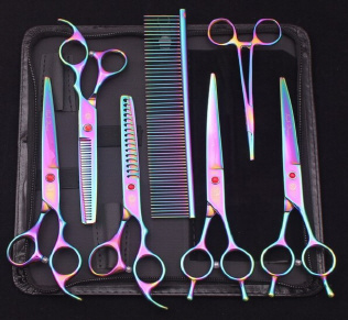Then I discovered Simply Seaweed, a tiny amount in dogs' dinner every day and plaque became a thing of the past. Scissors:Minimum quality: Japanese 440C stainless steel with 60HRC, usually written "JP440 60HRC". If you want to upgrade from these or you're wondering what all those numbers mean read my scissor page. You'll need straight scissors, curved scissors, thinning shears and small scissors for between eyes if you're unsure about going near eyes with the big curved ones. Chunkers are also handy (similar to thinners but take more hair), so look for a set that includes the four as you'll usually get a free storage case and comb with most of them. Buying in a set is much cheaper than buying individually - last time I checked the set pictured below was about $72 including GST and postage. Length of blade varies between different sets and is subjective - more details on my scissors page.
