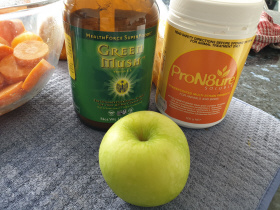 raw carrots with cooked pumpkin, green mush, probiotics, green apple,